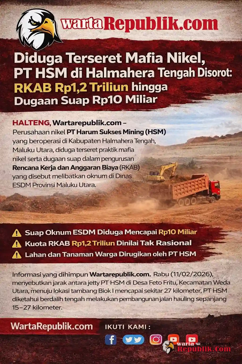 HALTENG, Wartarepublik.com - Perusahaan nikel PT Harum Sukses Mining (HSM) yang beroperasi di Kabupaten Halmahera Tengah, Maluku Utara, diduga terseret praktik mafia nikel serta dugaan suap dalam pengurusan Rencana Kerja dan Anggaran Biaya (RKAB) yang disebut melibatkan oknum di Dinas ESDM Provinsi Maluku Utara.