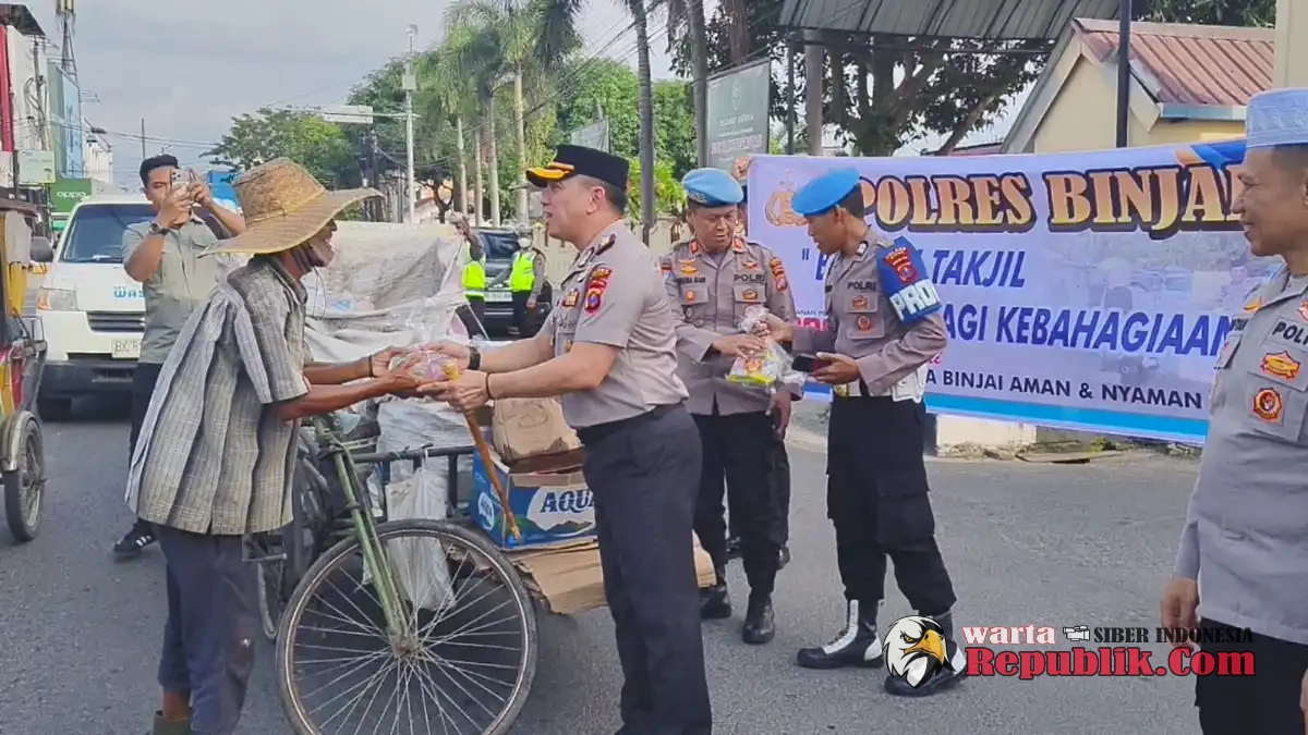 Kegiatan tersebut turut dihadiri Wakapolres Binjai Kompol Sofyan H. NST., S.H., M.H., bersama para Pejabat Utama (PJU) dan personel Polres Binjai. Jajaran kepolisian tampak solid membagikan takjil sembari memastikan arus lalu lintas tetap tertib dan lancar.