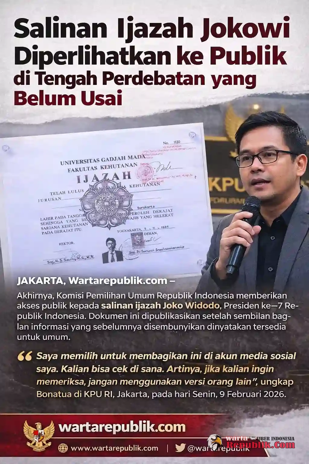 "Saya memilih untuk membagikan ini di akun media sosial saya. Kalian bisa cek di sana. Artinya, jika kalian ingin memeriksa, jangan menggunakan versi orang lain," ungkap Bonatua di KPU RI, Jakarta, pada hari Senin, 9 Februari 2026.
