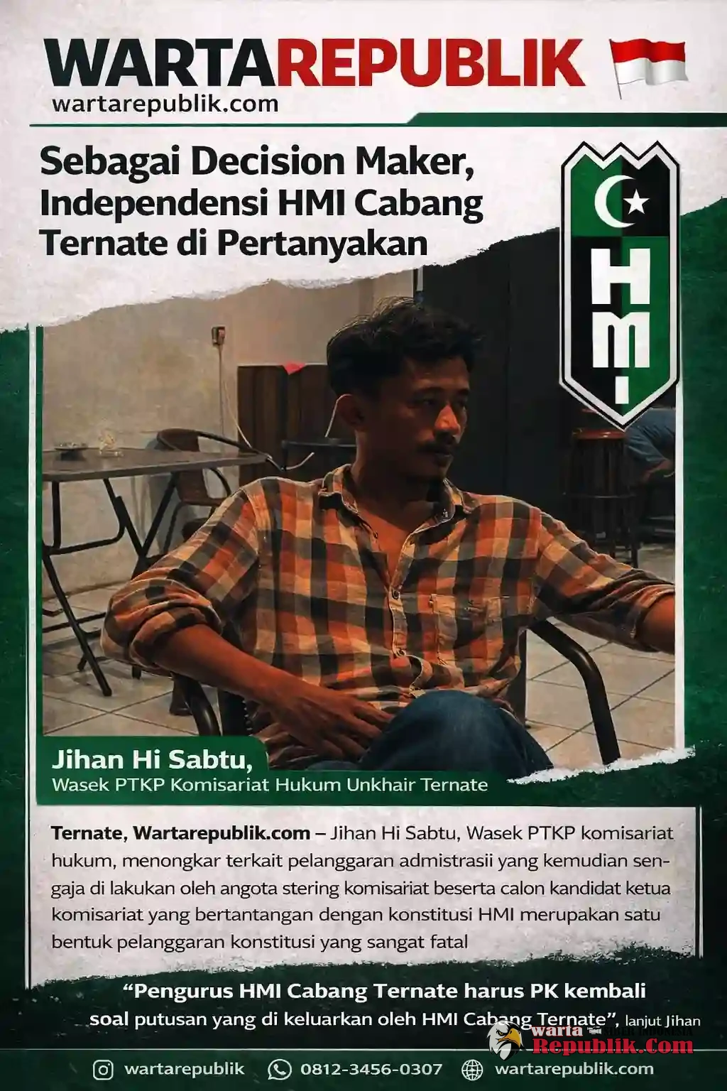 Ternate, Wartarepublik.com - Jihan Hi Sabtu, Wasek PTKP komisariat hukum, membongkar terkait pelanggaran admistrasii yang kemudian sengaja di lakukan oleh angota setering komisariat beserta calon kandidat ketua komisariat yang bertantangan dengan konstitusi HMI merupakan satu bentuk pelanggaran konstitusi yang sangat fatal