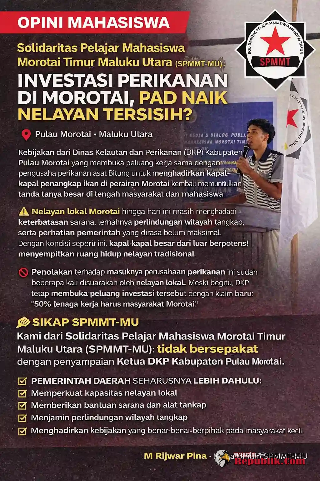 Oleh karena itu, kami dari Solidaritas Pelajar Mahasiswa Morotai Timur Maluku Utara (SPMMT-MU) menyatakan sikap tidak bersepakat dengan penyampaian Ketua DKP Kabupaten Pulau Morotai. Kami menilai bahwa pemerintah daerah seharusnya lebih dahulu memperkuat nelayan lokal melalui pemberdayaan, bantuan sarana, perlindungan wilayah tangkap, serta kebijakan yang benar-benar berpihak pada rakyat kecil.