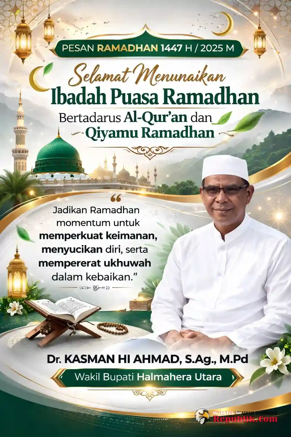 HALUT, Wartarepublik.com – Wakil Bupati Halmahera Utara, Dr. Kasman Hi Ahmad, S.Ag., M.Pd., mengajak seluruh masyarakat menjadikan bulan suci Ramadhan sebagai momentum untuk kembali menemukan ketenangan dan memperkuat hubungan spiritual dengan Allah SWT.
