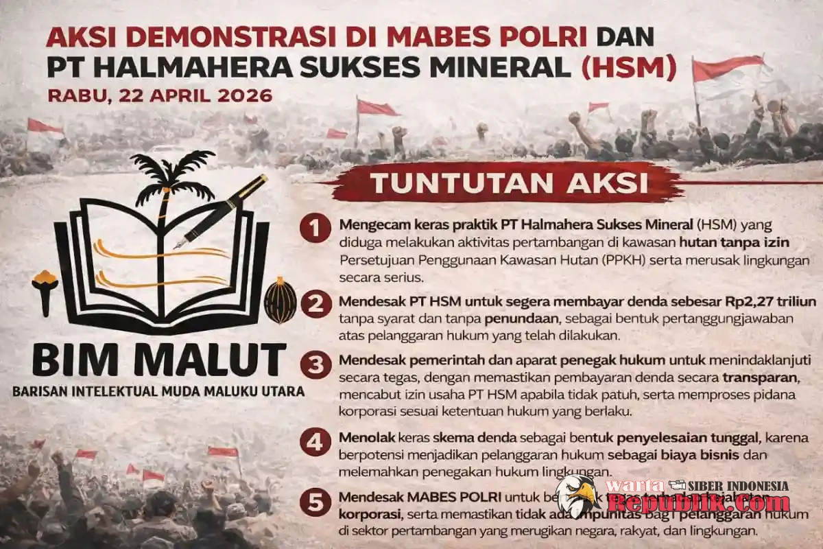Jakarta, Wartarepublik.com — Barisan Intelektual Muda Maluku Utara (BIM-MALUT) memastikan akan menggelar aksi demonstrasi pada Rabu, 22 April 2026, sebagai bentuk tekanan terbuka terhadap dugaan praktik pertambangan ilegal yang dilakukan oleh PT Halmahera Sukses Mineral (HSM). Aksi ini juga diarahkan ke Mabes Polri sebagai simbol desakan agar aparat penegak hukum tidak lagi bersikap pasif dalam menangani kasus kejahatan lingkungan berskala besar.
