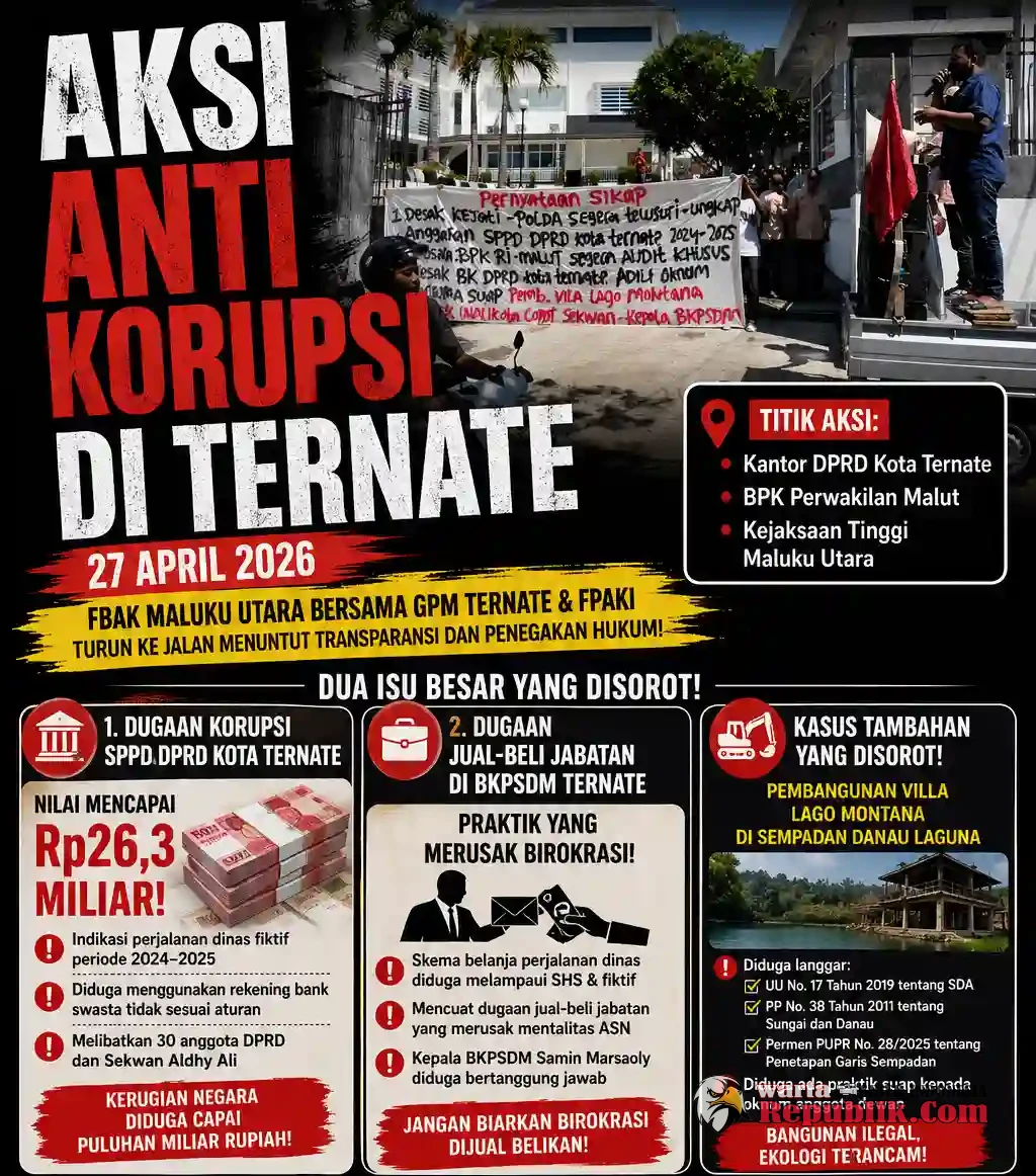 Ternate, Wartarepublik.com - Genderang perang terhadap praktik korupsi kembali ditabuh di Kota Rempah. Gabungan massa dari Front Bersama Anti Korupsi (FBAK) Maluku Utara yang melibatkan GPM Ternate dan FPAKI menggelar aksi unjukrasa di sejumlah titik vital, mulai dari Kantor DPRD, BPK Perwakilan Malut, hingga Kejaksaan Tinggi, Senin, 27 April 2026.