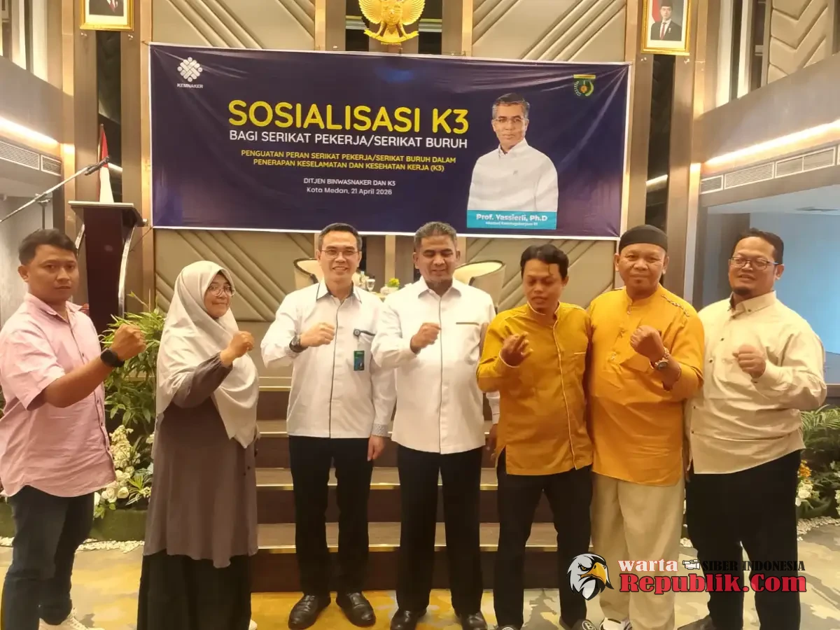 MEDAN, wartarepublik.com - Kementerian Ketenagakerjaaan RI menyebutkan kecelakaan kerja di daerah Sumut cukup tinggi, Hal itu dikatakan Staf Khusus Menaker RI Indra SH, MH, pada pembukaan acara Sosialisasi Keselamatan dan Kesehatan Kerja (K3) pada serikat pekerja/serikat buruh di Hotel le Polonia Medan, pada Selasa (21/04/2026).