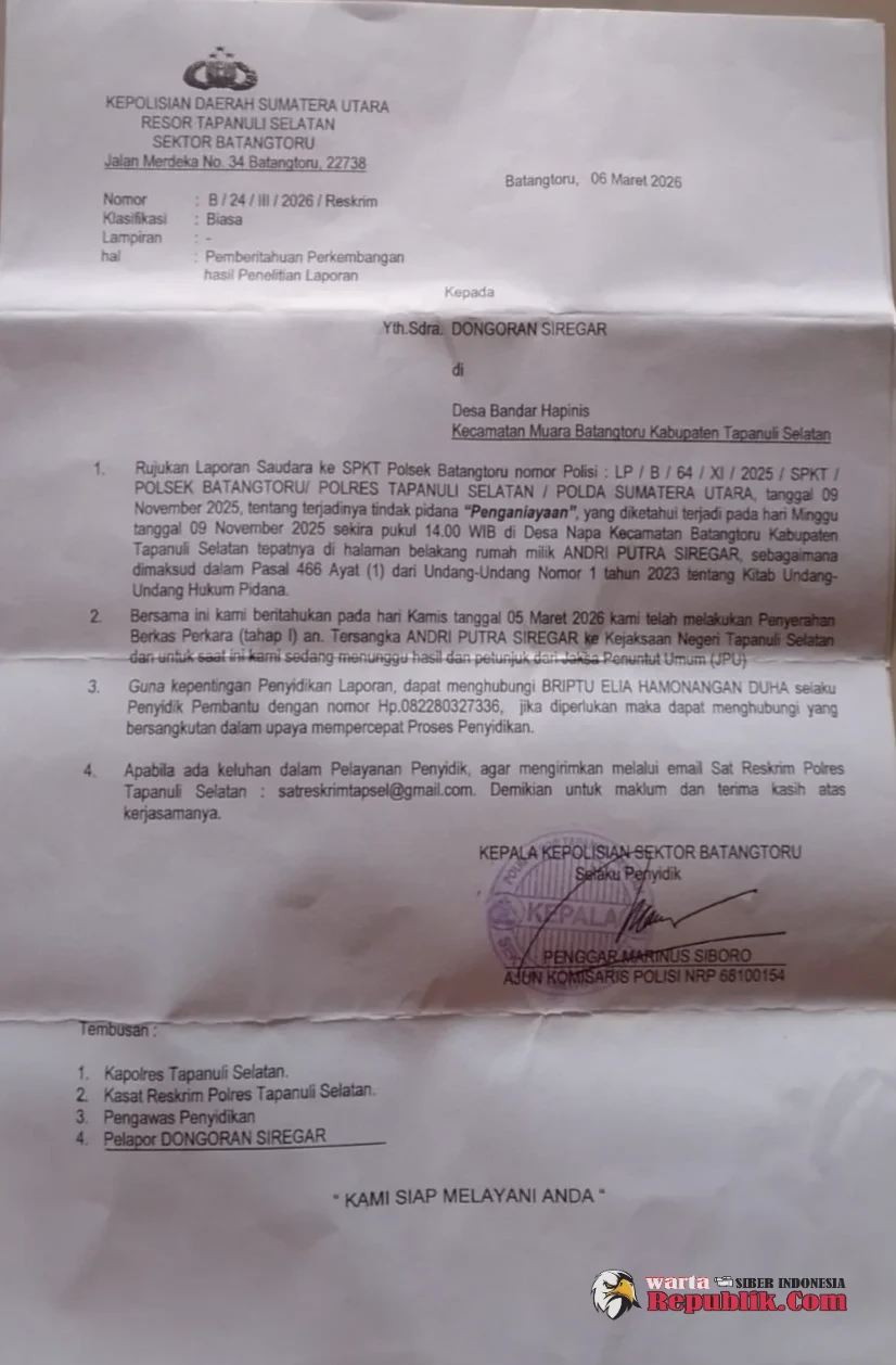 WARTA REPUBLIK.com | Tapanuli Selatan — Aroma ketidakberesan dalam penanganan kasus dugaan penganiayaan terhadap Dongoran Siregar kian menyengat. Aktivis menilai aparat penegak hukum terkesan lamban dan tidak tegas, bahkan memunculkan dugaan adanya pembiaran terhadap tersangka yang hingga kini masih bebas berkeliaran.