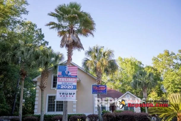 Papan dukungan terhadap Presiden Donald J. Trump terpasang disalah satu rumah di Satilla Shores yang merupakan tempat pelari Ahmaud Arbery di tembak dan dibunuh di Brunswick, Georgia, AS, Kamis (7/5). Pelari Ahmaud Arbery tewas setelah ditembak ketika sedang jogging di Brunswick pada 23 Februari 2020. - (EPA-EFE/ERIK S. LESSER)